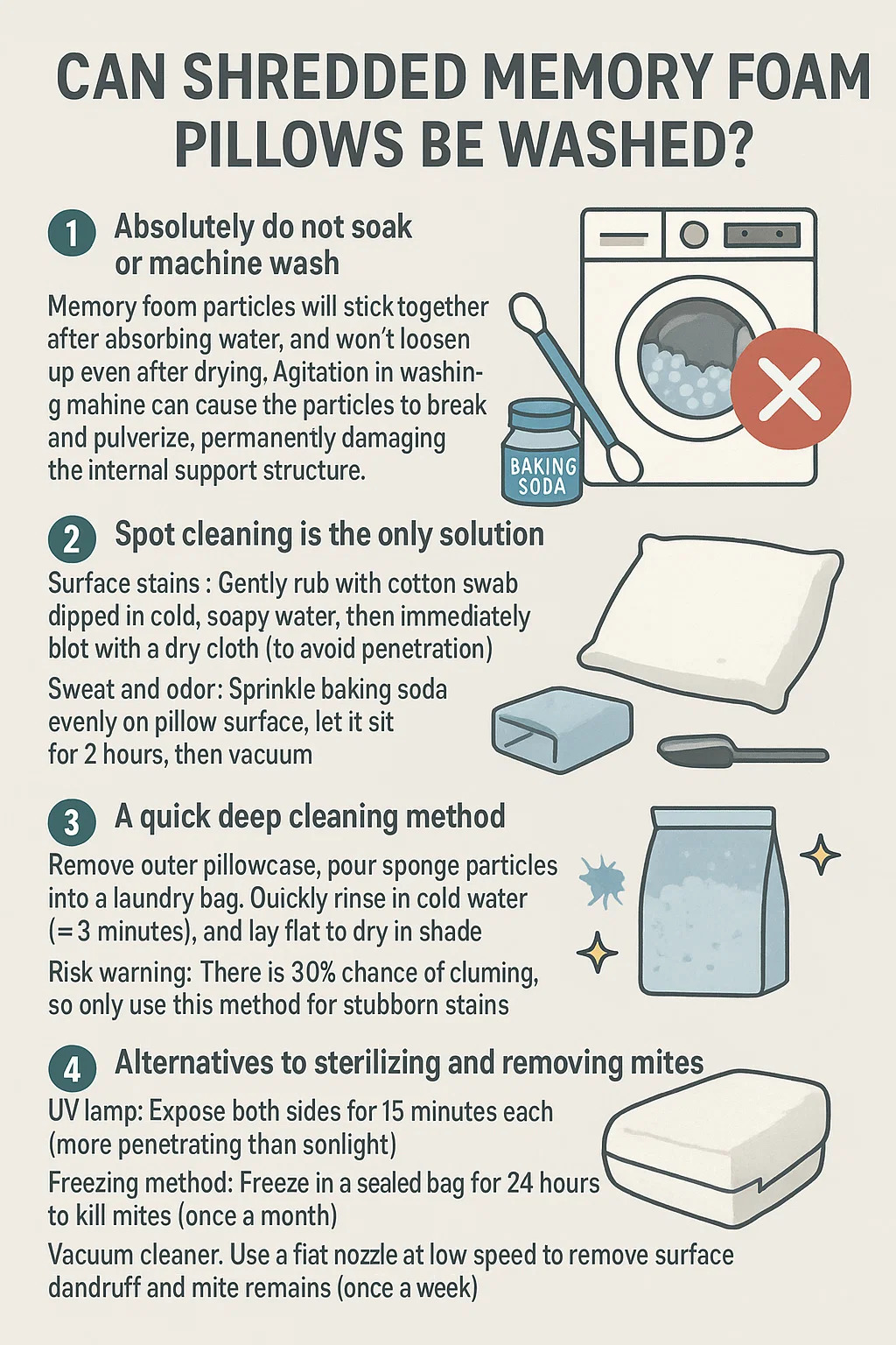 | Pranje stroja | Nikada | Uništava strukturu pjene → pretvara se u mokre kvržicu | Trajna šteta |