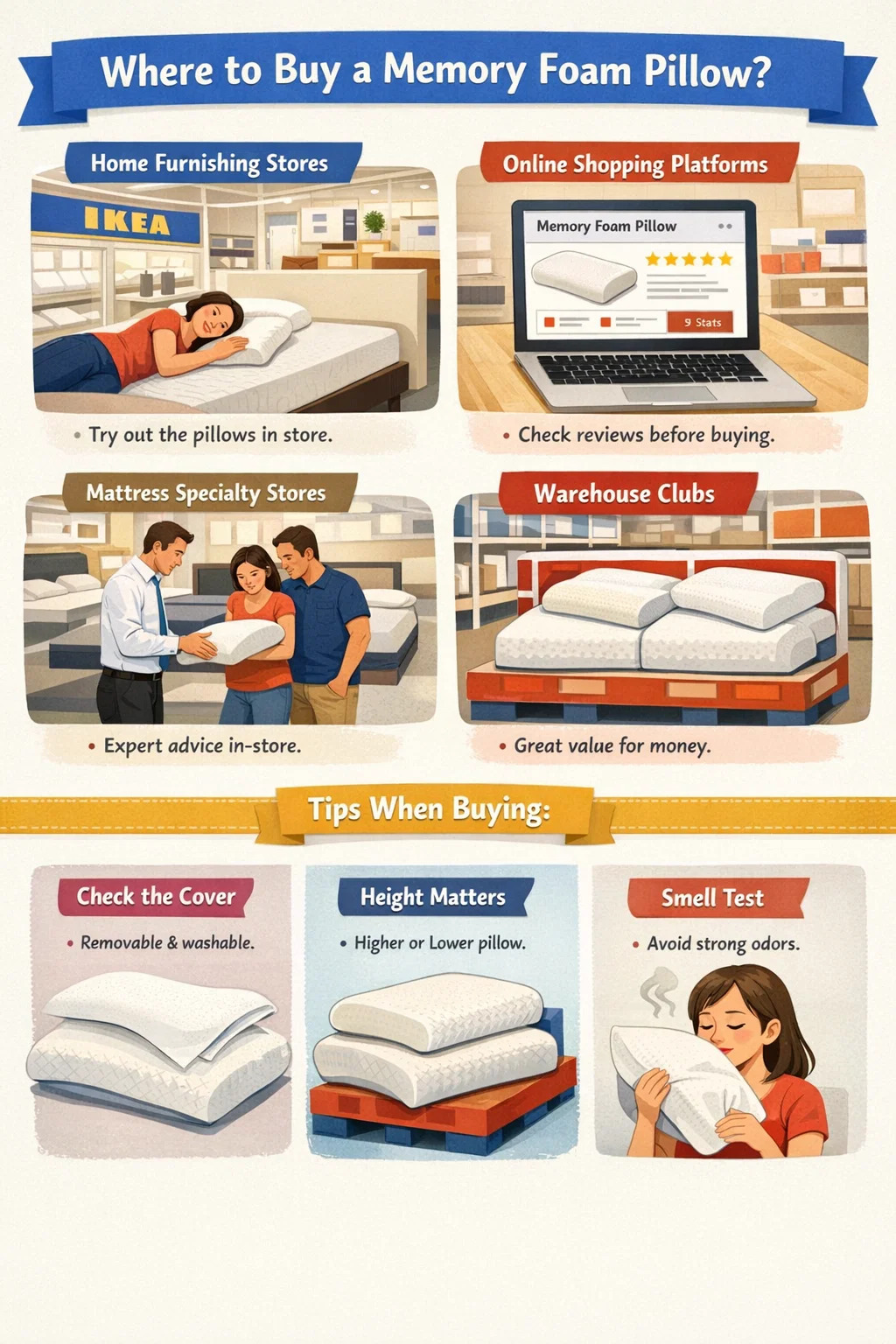 Mjesta kao što su IKEA ili specijalizirane trgovine za opremanje doma za mnoge su prvi izbor pri odabiru jastuka od memorijske pjene.